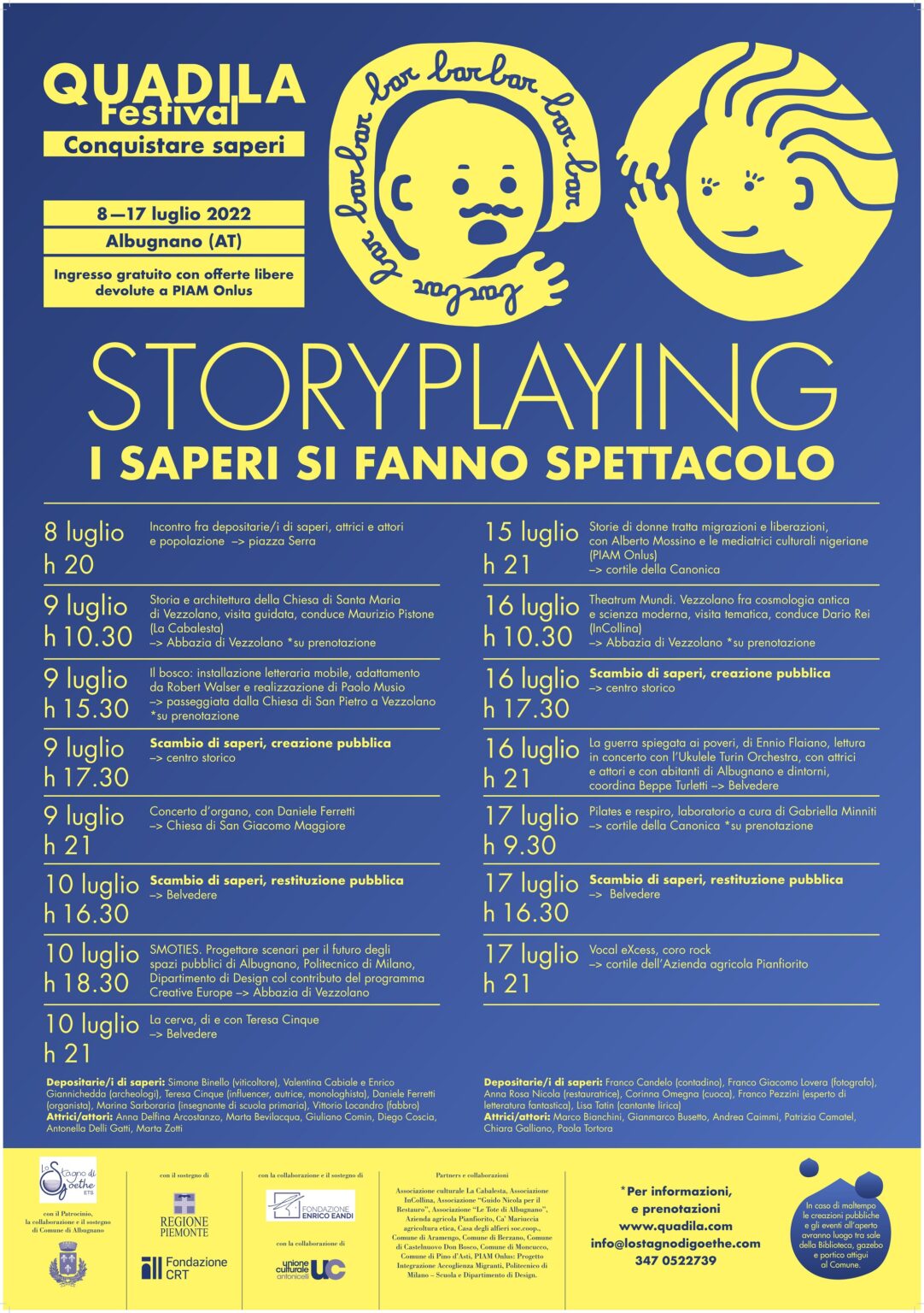 – “storyplaying“, un’idea di teatro e per un teatro che incida sul sistema sociale in cui opera, favorendo la nascita di un nuovo movimento culturale; un teatro che nasca dagli incontri, anziché pretendersi compiuto per affrontare incontri. Lo storyplaying non genererà mai “storyplayers”, depositari di una “tecnica”; ispirerà semmai l’azione di attrici e attori che, prima di tutto, pratichino provvisorietà e avventura per farsi operatori culturali.