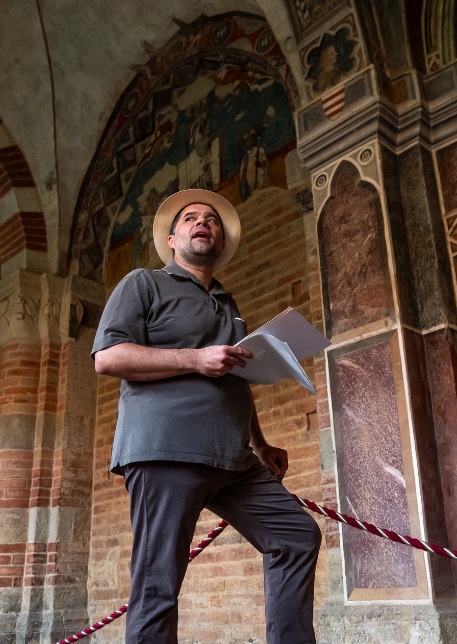 In questa “intervista immaginata/atipica a una delle componenti strutturali dell’Abbazia di Vezzolano” il protagonista è un singolare archeologo: dotato di una particolare sensibilità tattile, entra in contatto con una delle pietre che, insieme ai mattoni, compongono l’Abbazia di Vezzolano; la storia dell’Abbazia si dipana così proprio tramite il ricordo e il pensiero della pietra che la compone. Una modalità fantascientifica (o, più propriamente, “fantarcheologica”) per un esperimento di divulgazione che sceglie uno sguardo meno antropocentrico – o, comunque, più “antropo-responsabilizzante”: il punto di vista dei componenti strutturali dell’edificio oggetto di narrazione. L’intervista non si pone limiti, adotta una visione ampia e giunge persino a lanciare un messaggio sul cambiamento climatico: “l’elefante che ci ostiniamo a non voler vedere in questa piccola stanza dell’universo dove viviamo, che chiamiamo Terra”.