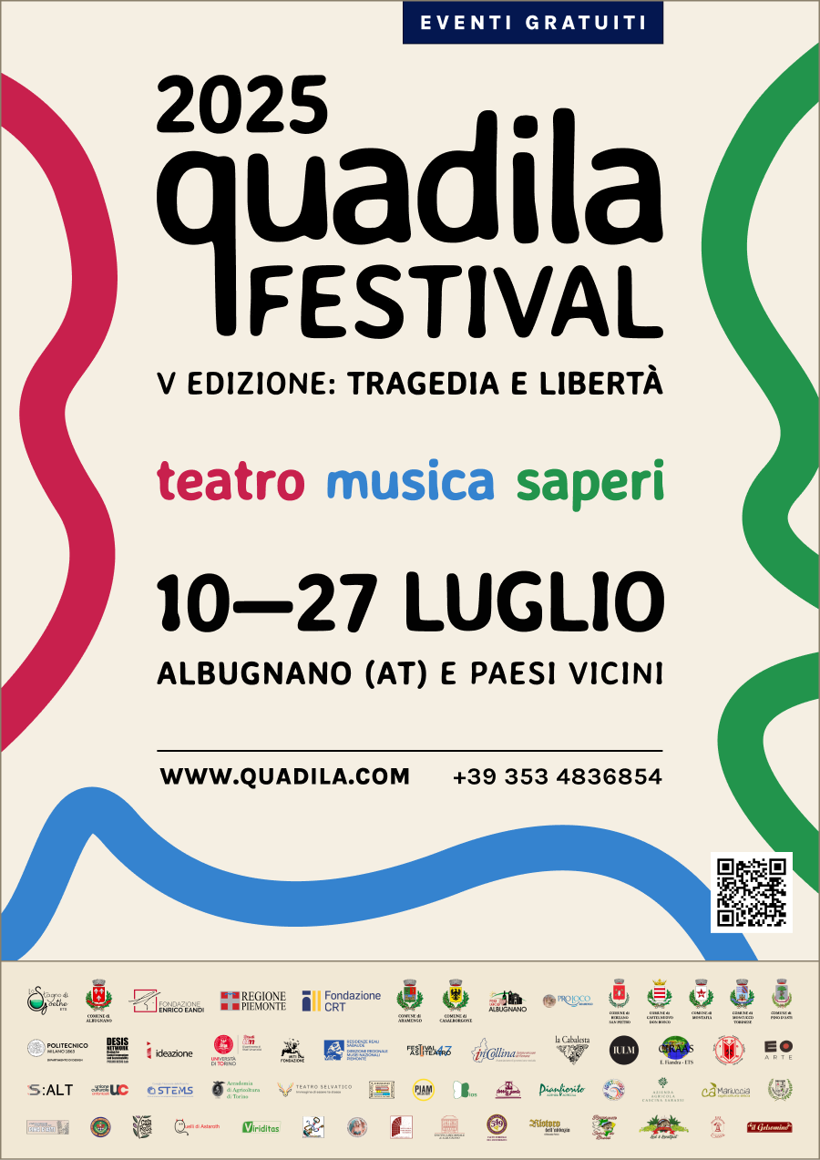 Giunto alla sua V edizione, QUADILA Festival 2025 ha come titolo “Tragedia e libertà" ed è declinato in numerosi eventi che includono spettacoli, concerti, scambi di sapere, installazioni letterarie, passeggiate, strad-rama. A fare da cornice principale, ancora una volta, è il borgo di Albugnano, il "balcone del Monferrato", con le sue colline, i suoi tesori, la sua gente. Gli eventi si estendono ad animare anche i paesi vicini del Basso Monferrato.
